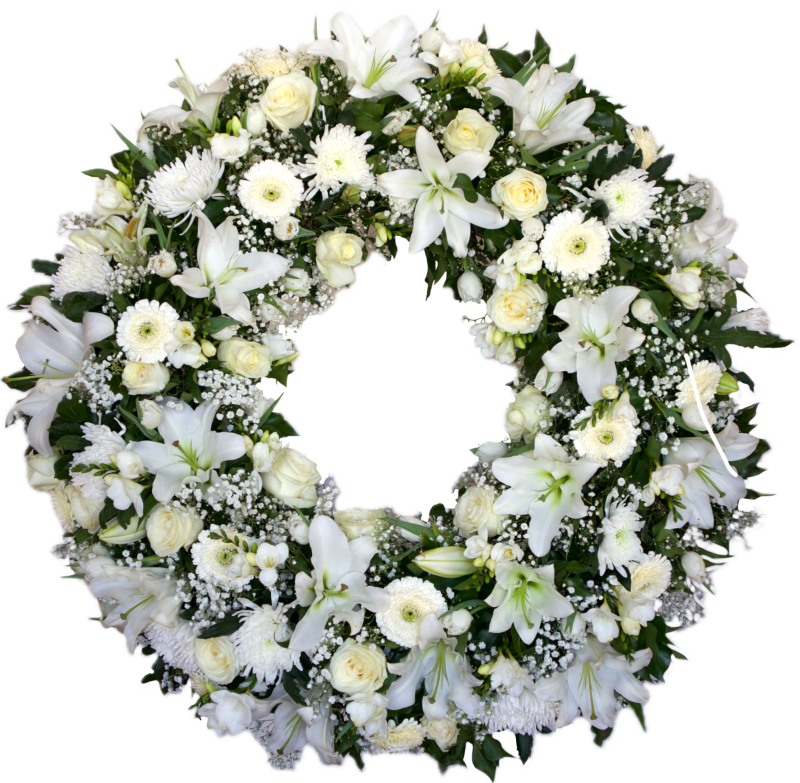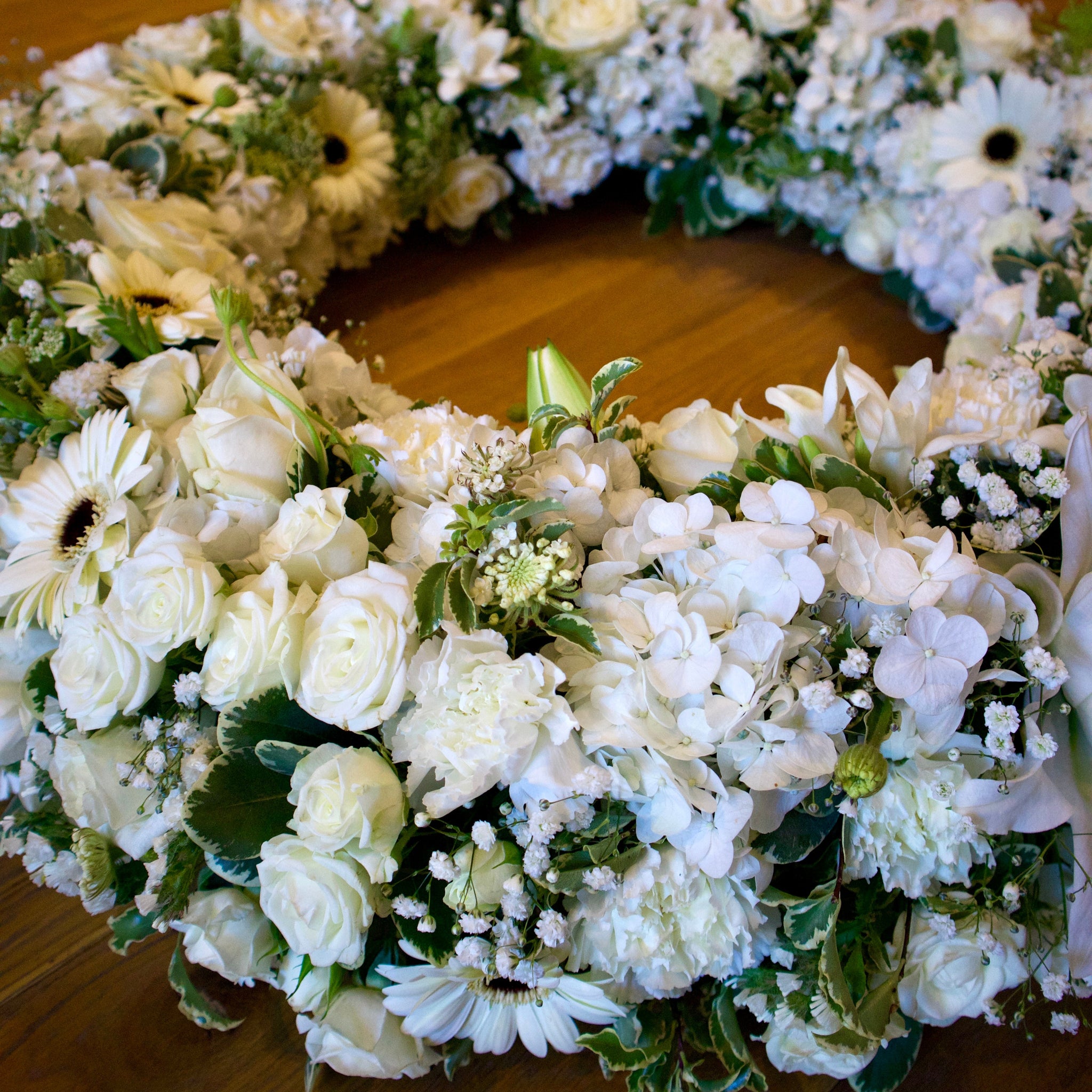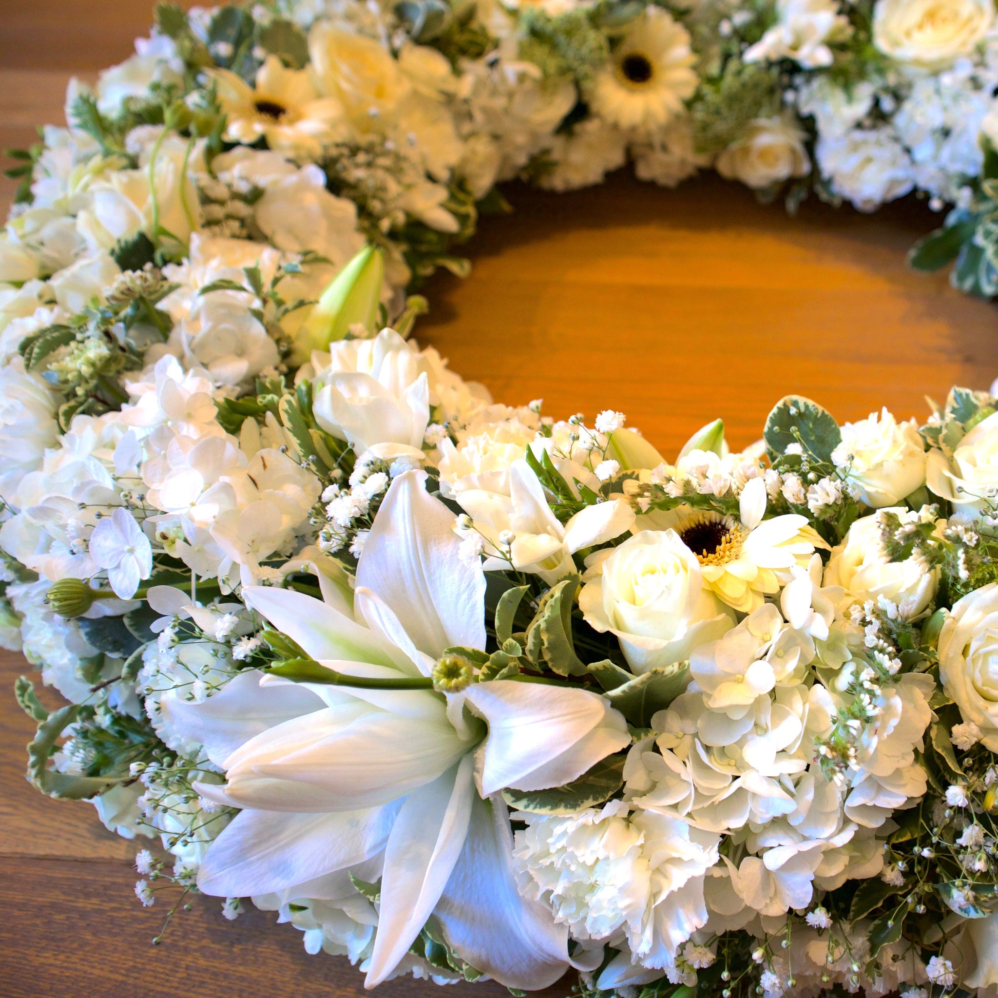 Dieser Biedermeierkranz in reinem Weiß steht für Frieden, Stille und innere Ausgeglichenheit – ein stilvolles Zeichen liebevollen Abschieds.