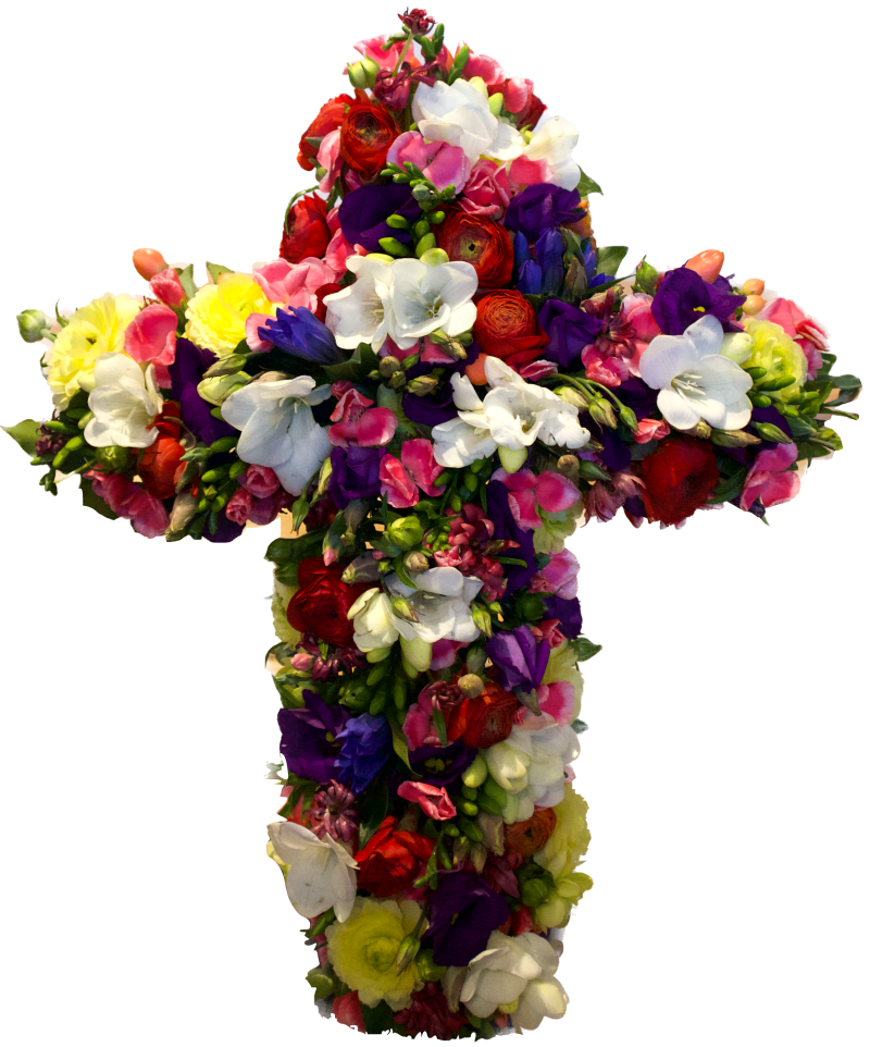 - Gesteck in Kreuzform aus gemischten Blumen