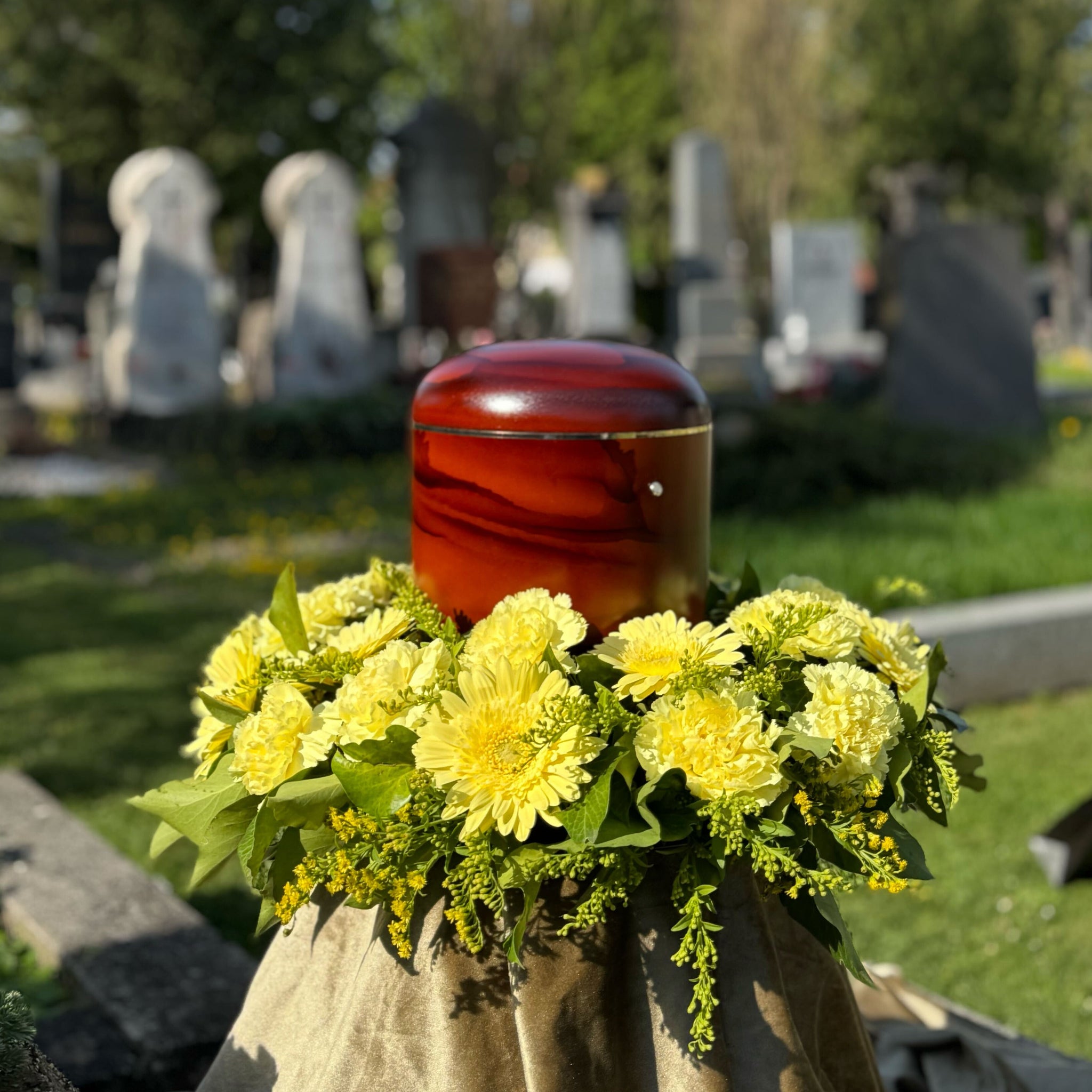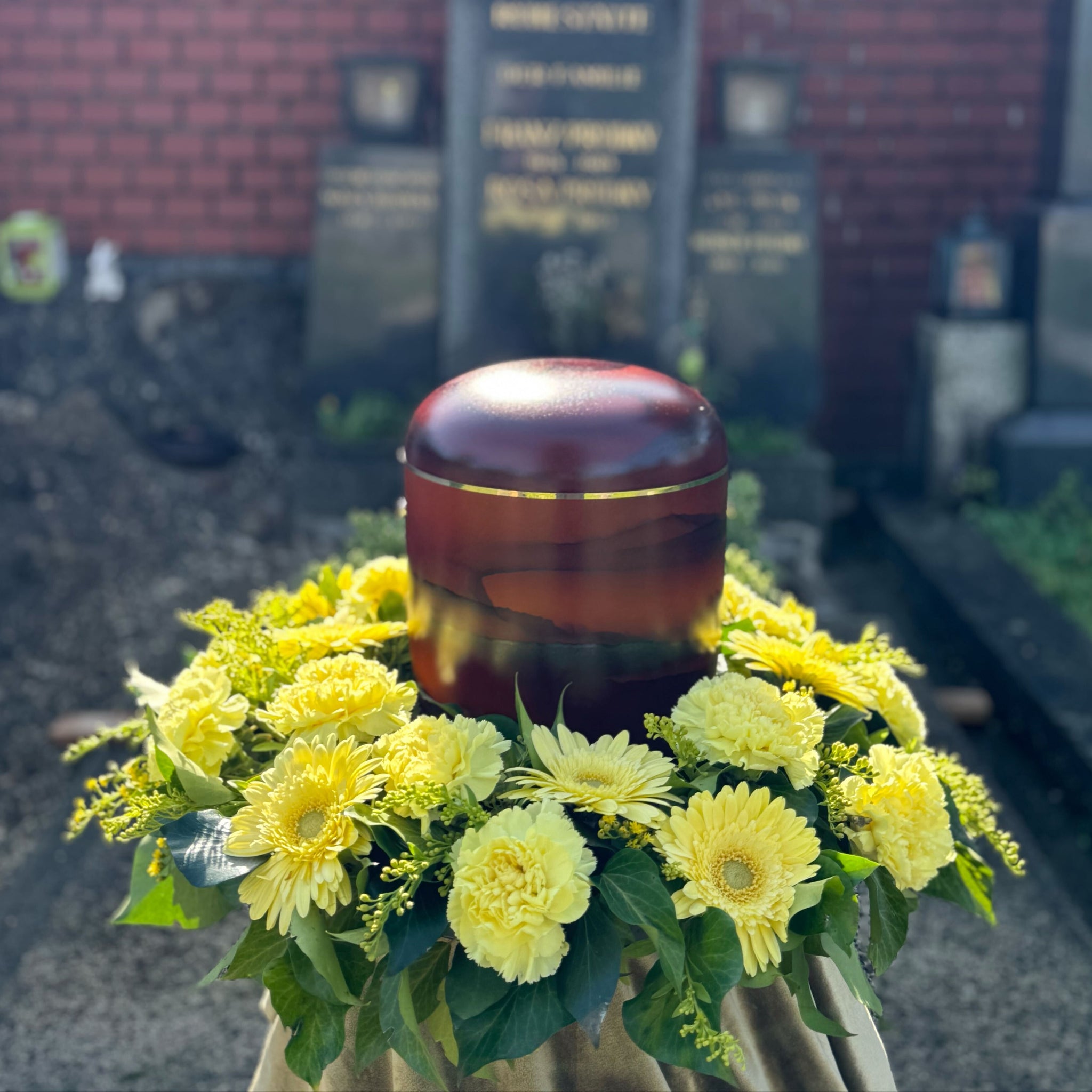 Dieser Urnenkranz in warmem Gelb bringt Licht und Hoffnung in den Abschied – ein Zeichen der Dankbarkeit und inneren Stärke.