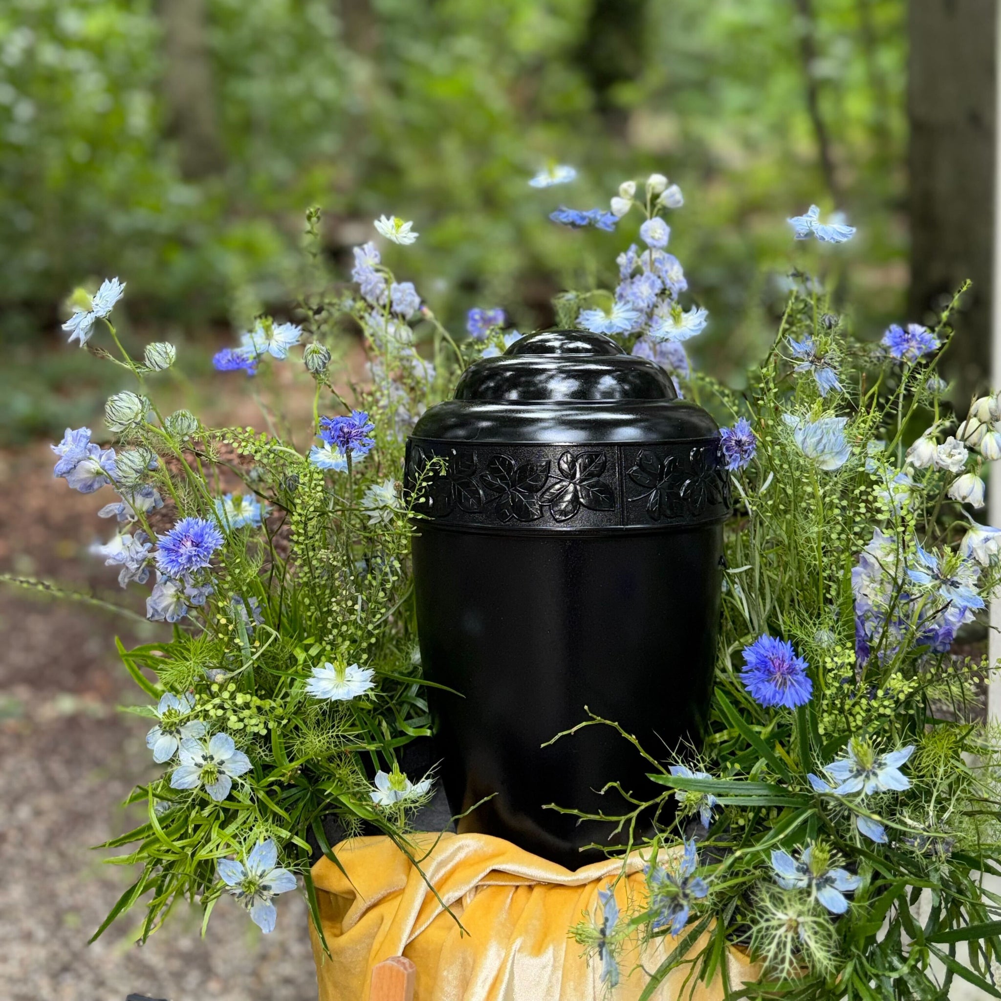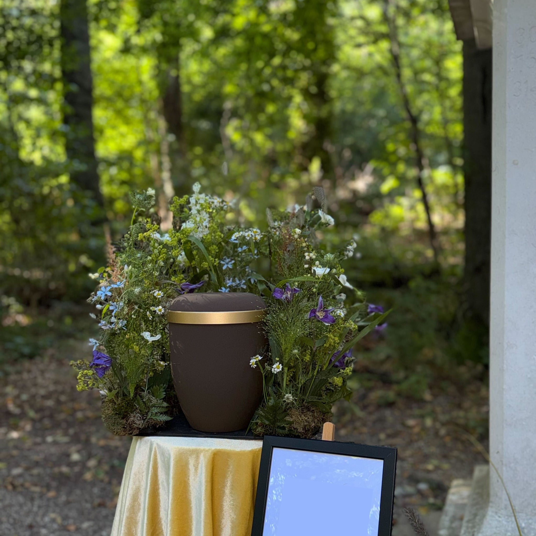 Dieser Urnenschmuck wirkt wie frisch von der Wiese gepflückt – ein liebevoller, naturverbundener Abschiedsgruß.